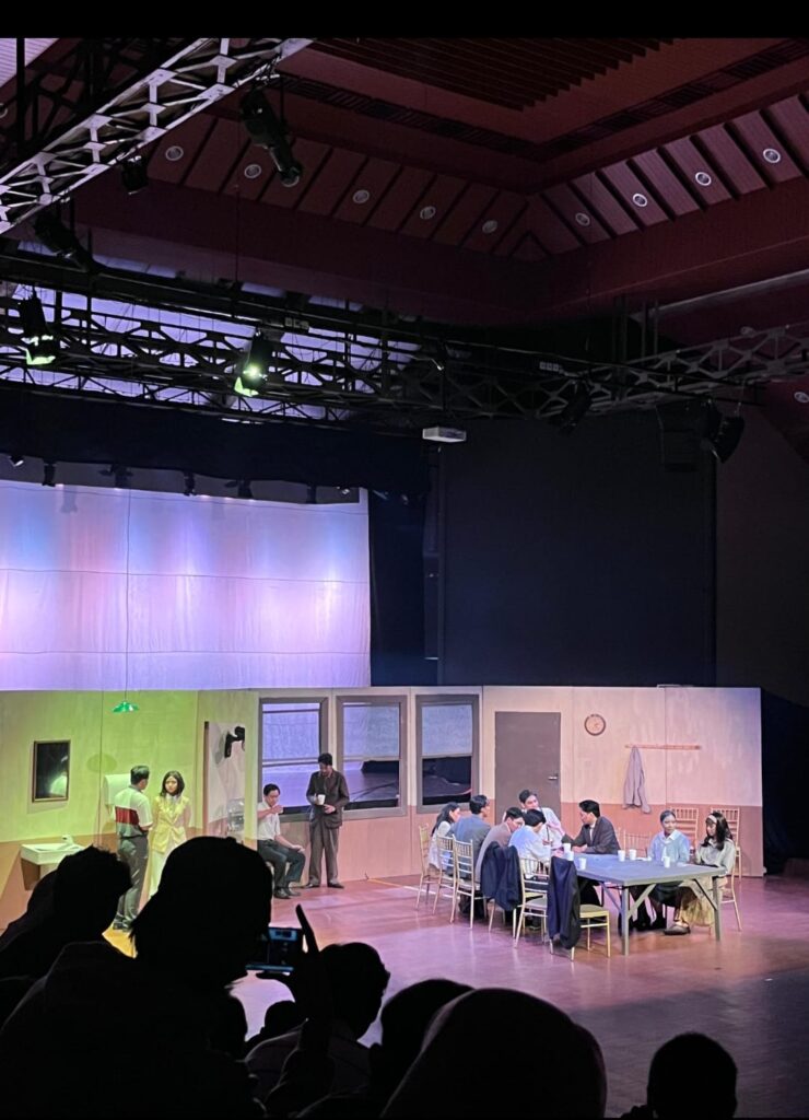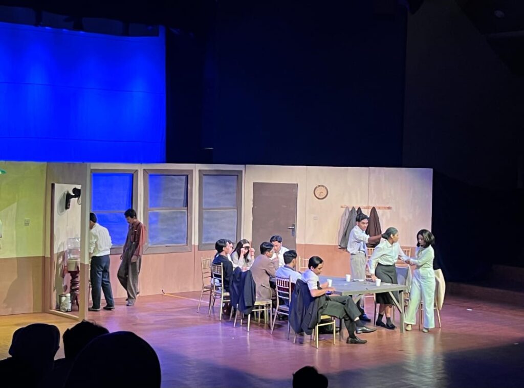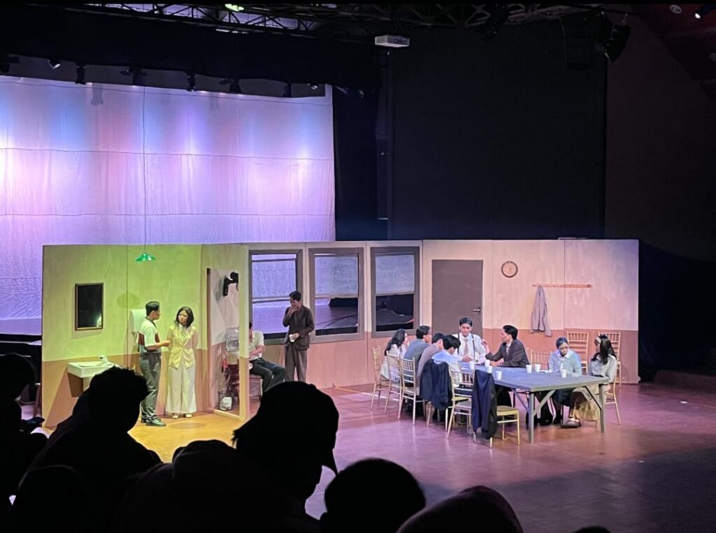 Namun, pencapaian konseptual yang apik ini sayangnya terbentur pada dinding eksekusi yang kurang presisi. 12 Orang Marah sejatinya membutuhkan apa yang disebut sebagai atmospheric dramaturgy—sebuah kondisi di mana ruang tidak hanya dijadikan sekadar latar, melainkan subjek. Karena seharusnya panas musim panas di New York dalam naskah aslinya tidak hanya dekorasi cuaca semata, tapi difungsikan sebagai katalisator yang mendorong saraf-saraf para juri hingga ke titik didih. Di panggung ini, kegerahan itu sayangnya belum menjelma menjadi “aktor ke-13”. Saya tidak melihat peluh yang mengganggu, atau kegelisahan tubuh yang merasa terperangkap dalam suhu yang mencekam. Tanpa tekanan suhu ini, kemarahan para tokoh terkadang terasa muncul dari ruang hampa dan bukan sebagai akibat dari tekanan lingkungan yang gerah.