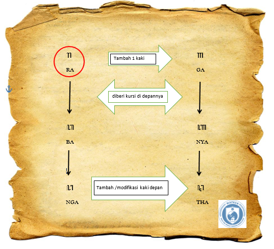 Kelompok pertama seperti pada gambar di atas berpatokan pada aksara Ra. Huruf tersebut dimodifikasi dengan menambahkan 1 kaki sehingga membentuk aksara Nga. Berikutnya kedua aksara tersebut diberi ‘kursi’ di depannya hingga menjadi Ba dan Nya.