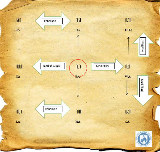 Masing-masing aksara turunan Pa tersebut masih bisa dimofikasi lebih lanjut. Huruf Ha jika dibalik akan menjadi huruf La. Demikian juga aksara Sa yang dibalik akan berbunyi Da. Aksara Wa bisa dimodifikasi dengan 2 cara. Jika diberi lingkaran kecil di depan akan menjadi aksara Ca. Sedangkan jika diberi ‘singgetan’ di tengah akan berubah menjadi aksara Dha.