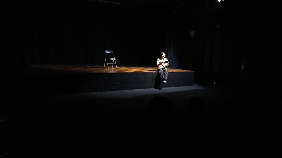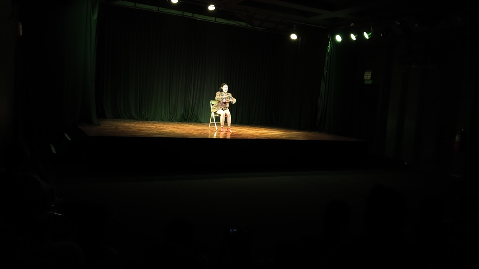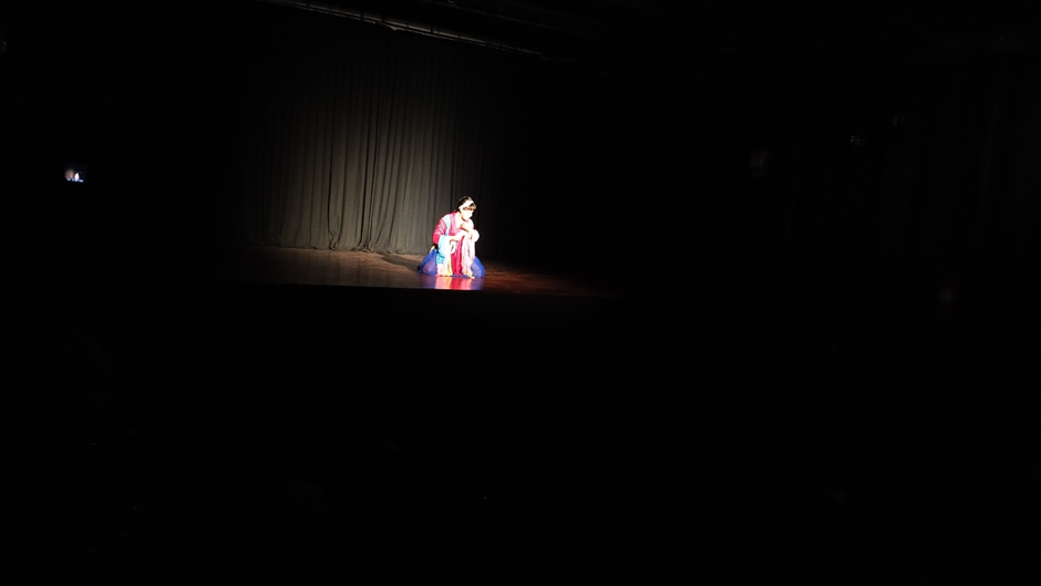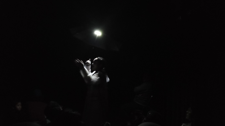 Untuk sejenak, pertunjukan tak langsung bersambut nomer. Panitia menata satu setting teknis kecil di atas panggung. Setelah hal itu siap, pembawa acara pun membacakan narasi pengantar, membacakan narasi puitik yang membuka pertunjukan Kinanti Sekar berjudul “Setitik”: Untuk mereka yang percaya, bahwa hujan adalah rapal doa… Setelah hening sejenak, sound yang memberi suara hujan terdengar. Ah, kau teringat tanyamu yang agak silam: Apa suara tik-tik-tik adalah suara hujan, atau suara benda-benda yang terkena hujan? Imaji hujan lekas muncul; dan kau, juga penonton lain, seperti berada dalam hujan. Setelah keterhanyutan awal, dari pintu samping bawah, muncul Kinanti Sekar. Ia masuk dengan membawa sebuah payung. Dan meski yang terang ada di dalam payung, sebab teknis lampu senter kecil, tapi di sepasang matamu malah mempertebal imaji hujan di luar. Itu kali, Sekar memakai kostum hitam-putih—juga dengan tambahan jas hujan putih bening. Di sepasang matamu, hal itu membawa kepada suatu imaji hujan yang kian kuat, hujan yang silam yang dibebani nuansa liris-romantis. Hujan yang terasa lembut, batinmu. Ia bergerak hangat di antara penonton, merespon sekalian yang ada dan hadir menyaksi. Tubuhnya, setidaknya di matamu, jadi tubuh penari yang tengah berpantomim; atau malah sebaliknya, tubuh pantomim yang menari. Ia tampaklah seperti kanak yang bermain hujan, bermain kecipak, dan terpukau ketika melihat pantul benda-benda di genangan; dan di sepasang matamu, kau seperti melihat pelataran halaman, lembut taman penuh tanaman yang basah. Ah, kau jadi rindu gadis itu, gadis yang suka pada bebunga liar dan suka ingin bermain hujanan… Kinanti Sekar perlahan sampai ke atas panggung depan; dan mencantolkan payung itu di tiang yang ada, tiang yang di-setting di awal. Ia mengambil air dengan sepasang tangan; menciduk air hujan. Dan kau lagi-lagi tertegun: imaji air itu sungguh benar tampak di sepasang matamu, terbayang di dalam kepalamu, dan kau rasai sejuk dingin hujan itu…